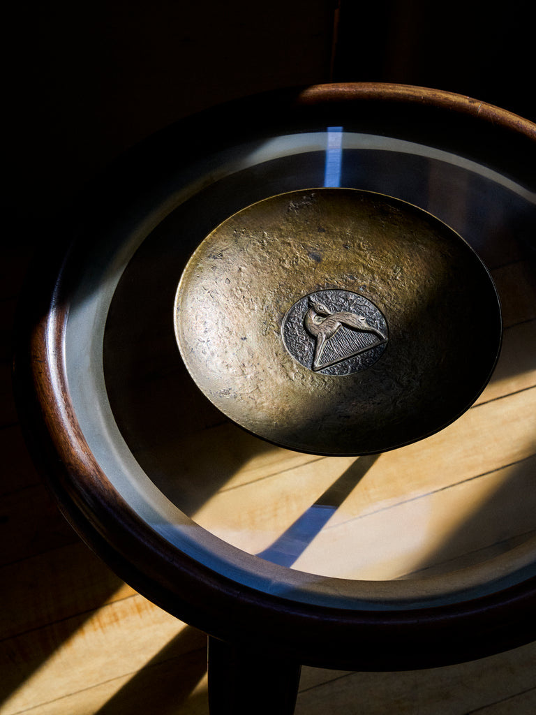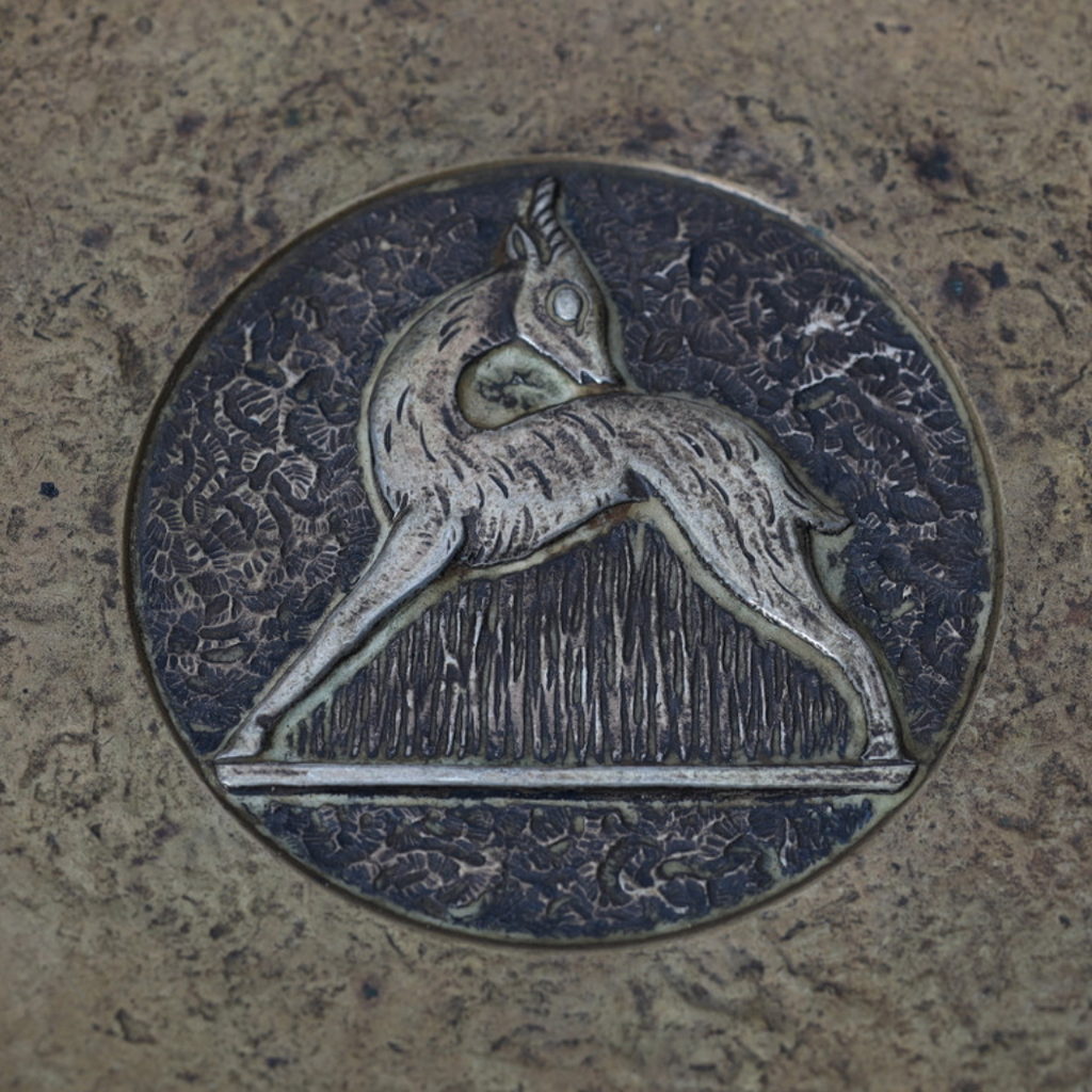 This solid cast bronze footed dish features a detailed Swedish Grace deer relief by Evan Jensen (1888-1978). Originating from 1940s Denmark, it is stamped "226 S" and marked “Bronze Evan Jensen Københaven” on the underside. The dish combines a darker contrasting relief with a sturdy footed base.