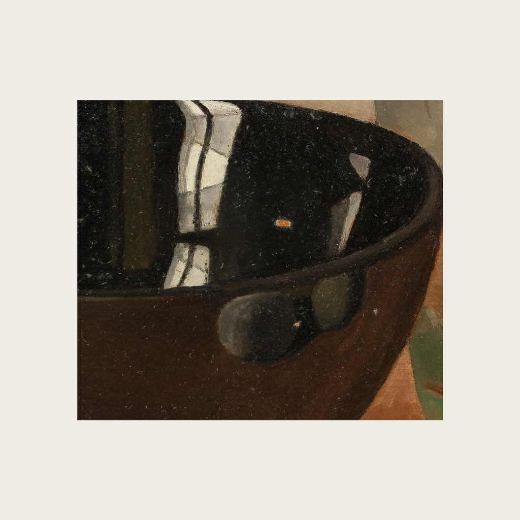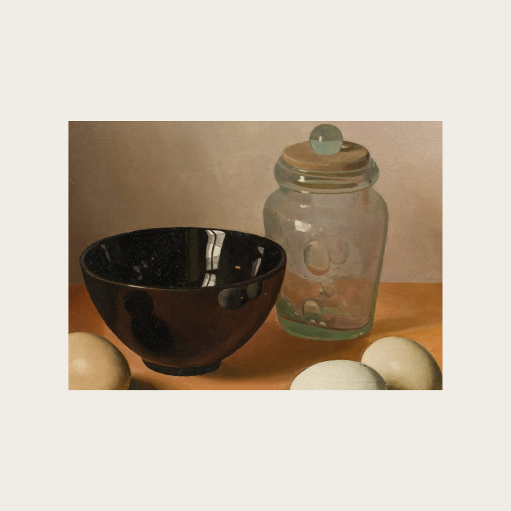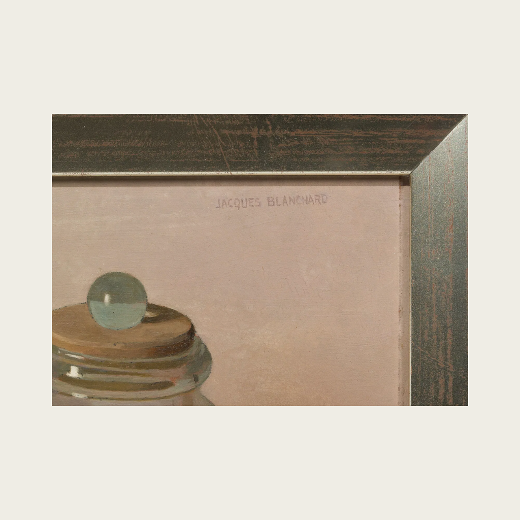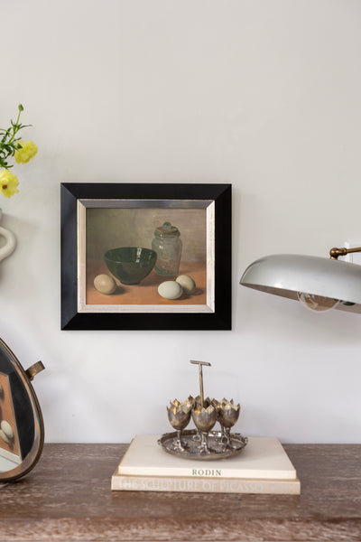 1950's still life oil painting by Jacques Blanchard (1912 - 1992). Oil on board, with black and silver beveled edge wood frame depicting shadowed still life scene of eggs, bowl and lidded glass jar. Shadows, reflections and varying light give the work layers of depth. Signed by artist on upper left corner, undated.