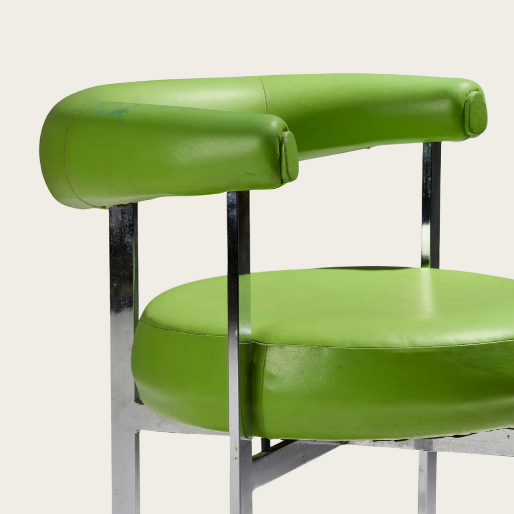 This extremely rare 1966 Thonet Barrel Back Chair, Model 4665, features a chrome-plated steel frame and original vinyl upholstery. It includes a paper distributor's label underneath marked "Thonet Industries, Inc. One Park Avenue, New York 16, N.Y." The chair has not been reupholstered yet and is available for re-upholstery in COM for an additional cost.
