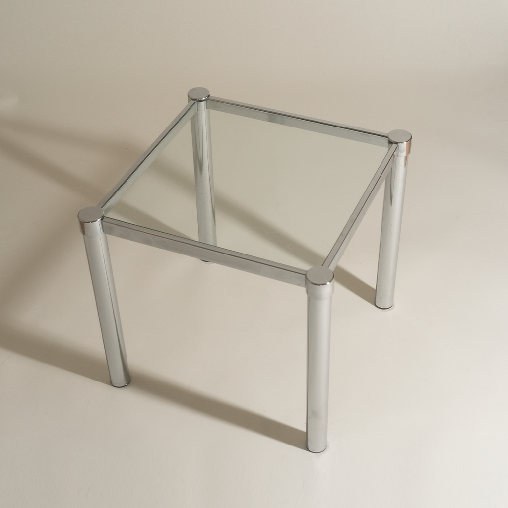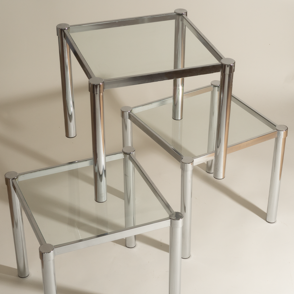 Trio of three square stackable chrome framed glass tables with rounded legs. They can work spread throughout a space as individual side tables or as a trio for a coffee table series. They are in good vintage condition with surface level scratching commensurate with age and use.